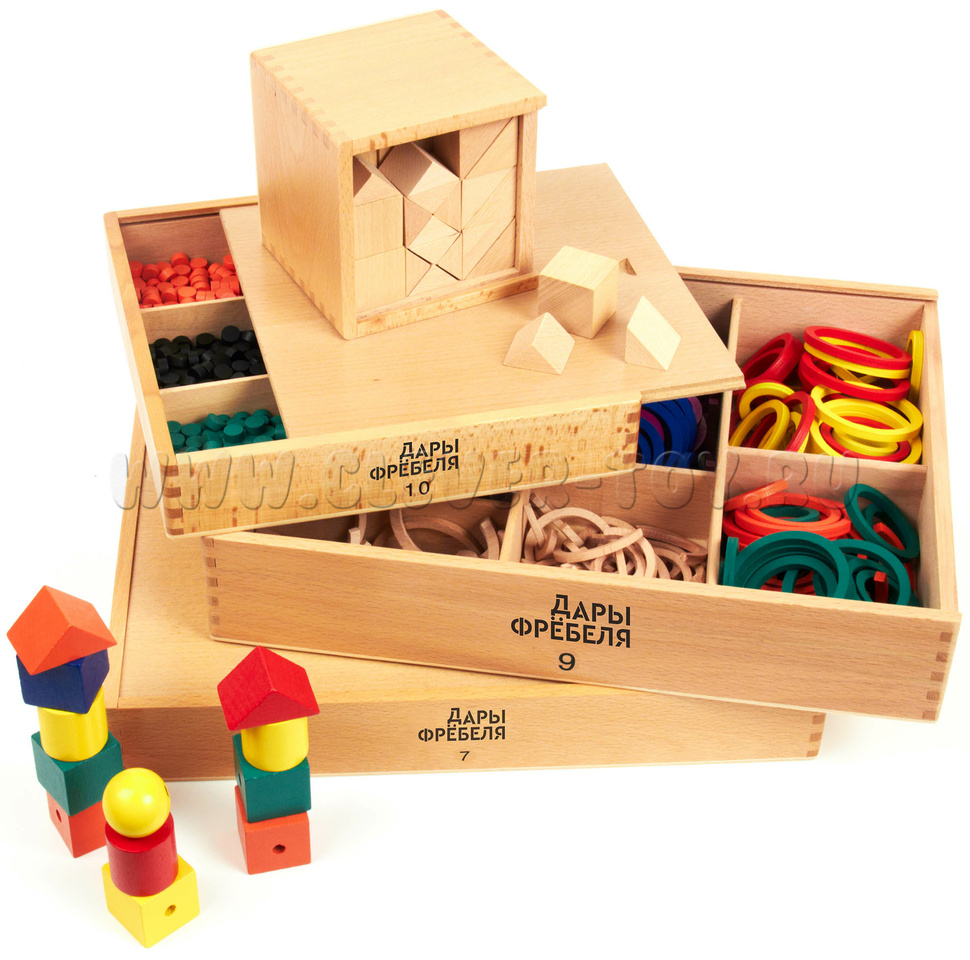 Игровой набор "Дары Фребеля" изготовлен из качественных натуральных материалов (дерева и хлопка). В комплекте 14 модулей и 6 методических пособий соответствующих ФГОС ДО.