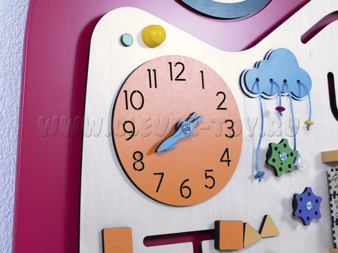 Бизиборд "Вит" предназначен для детских образовательных учреждений и помогает изучать геометрические фигуры (форму, количество углов, вид, цвет и особенности). Задания составлены по принципу "от простого к сложному". Например, при изучении геометрических фигур можно тренироваться в счёте, определяя количество углов. Также можно рисовать запомнившиеся фигуры или играть в крестики-нолики, вращая фигуры.