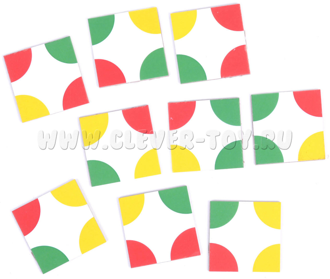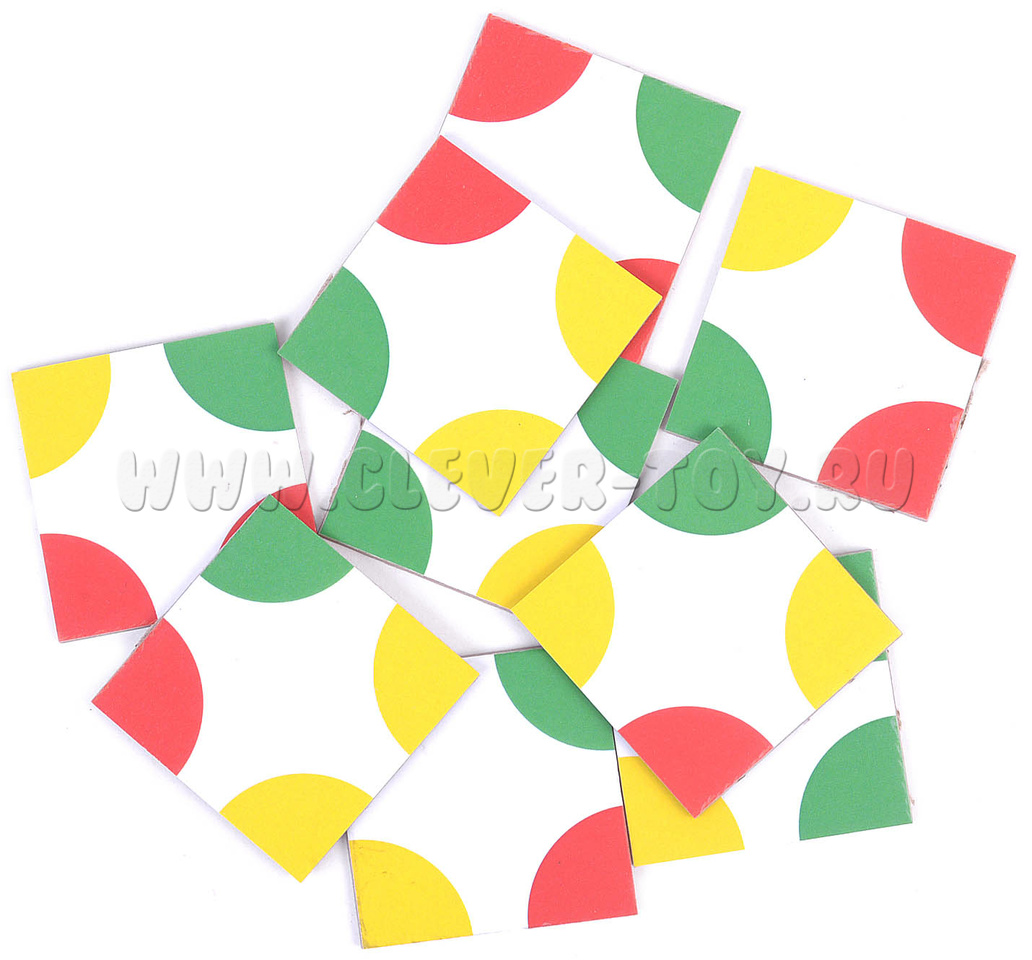 Игровые элементы этой головоломки - набор из 9 квадратных фишек с нанесенными на их углах разноцветными секторами круга. Следуя инструкции попробуйте выполнить все задания: от простых до сложных.