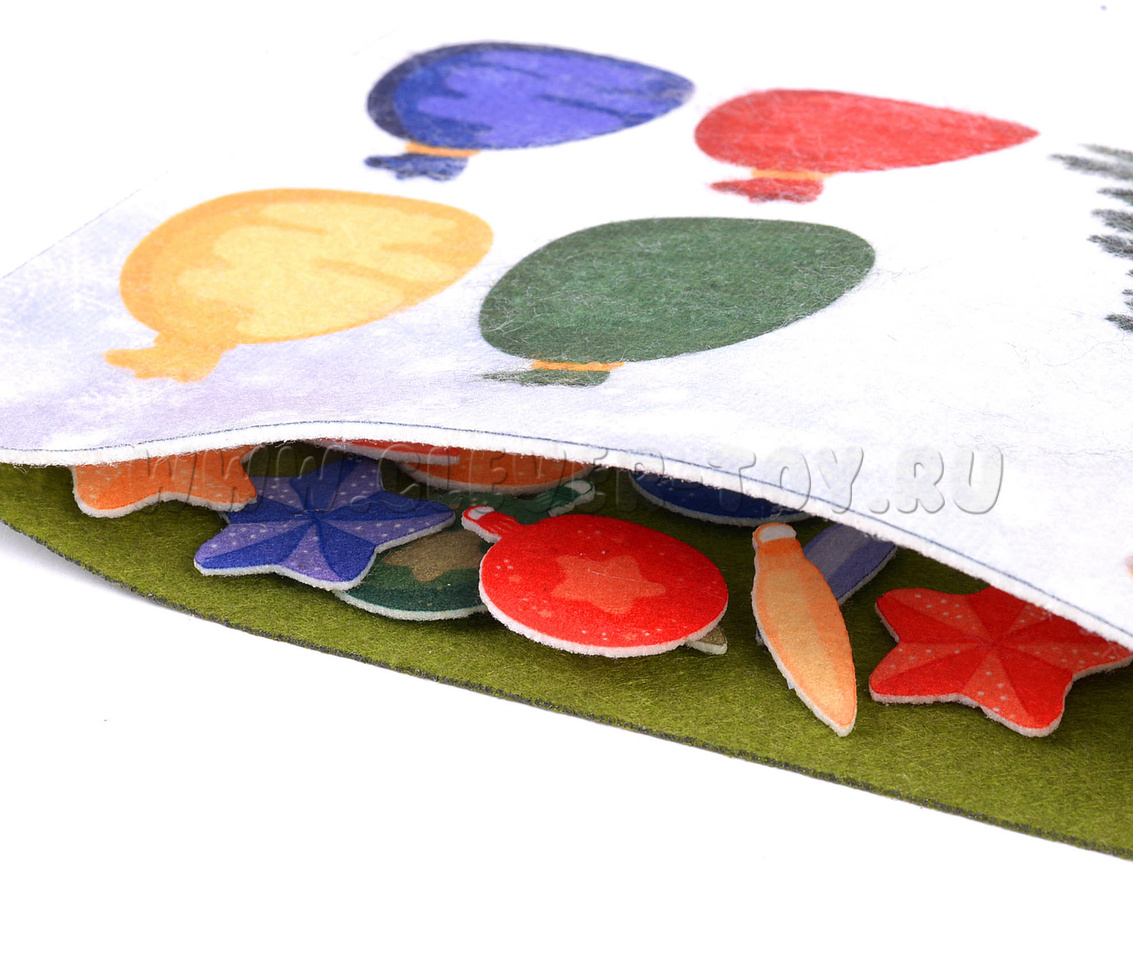 У каждой фигурки сзади есть липучка, при помощи которой можно размещать их на игровом поле. Ребенок может поместить игрушку на елку или распределить в мешочек по цвету.