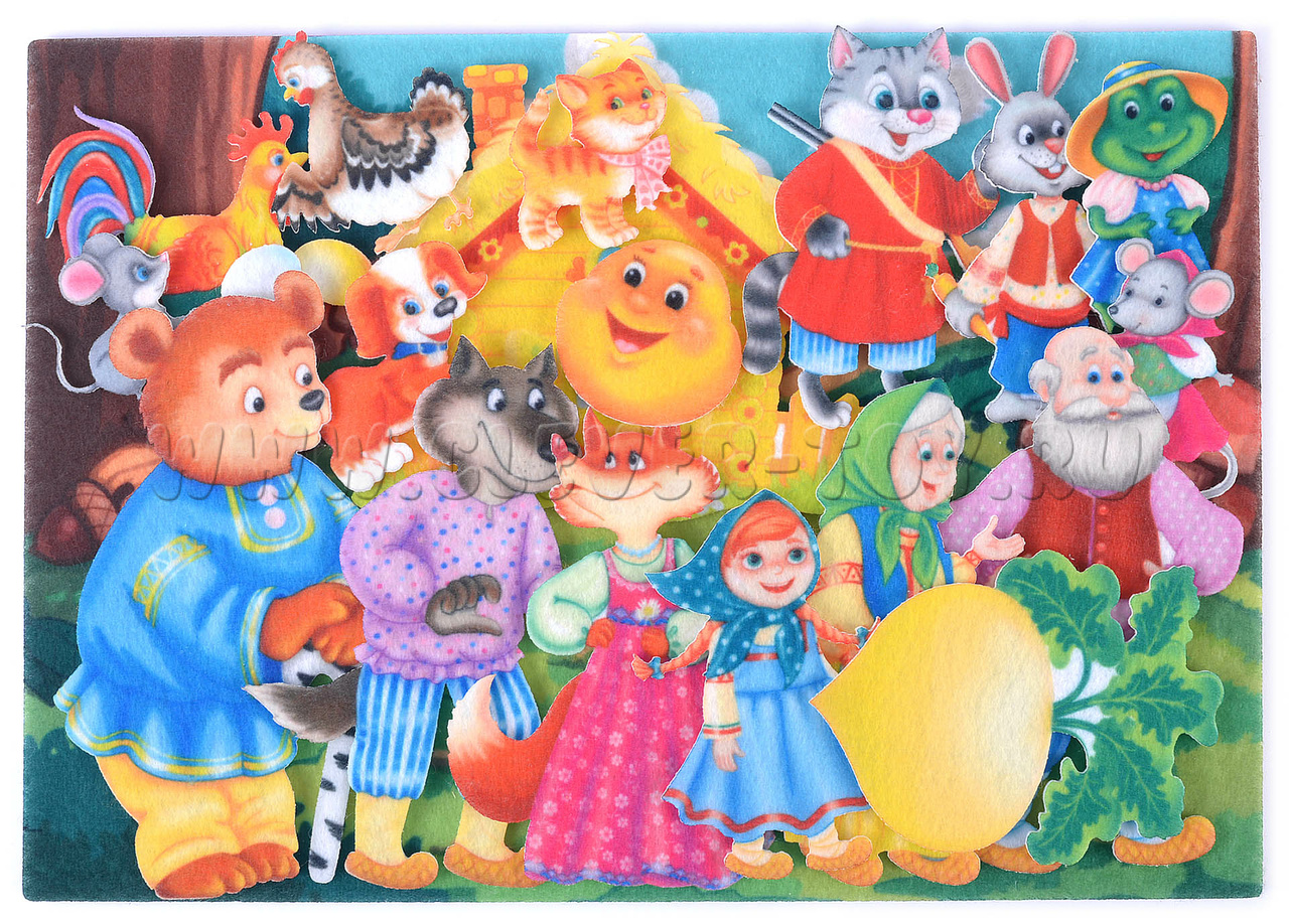 В комплект входит игровое поле с изображением зелёной лужайки и деревьев. Также в наборе есть фигурки лягушки, домика, репки, медведя, мышки, Колобка, собачки, волка и других персонажей. Всего в комплекте 19 фигурок.