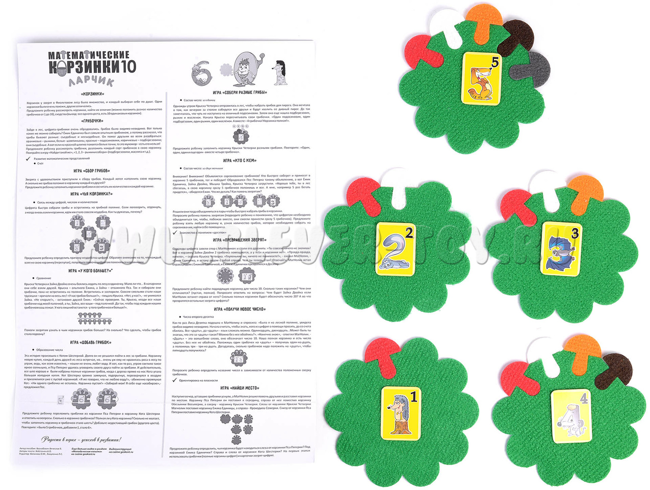 Игру «Математические корзинки Ларчик 10» можно использовать как самостоятельное демонстрационное игровое пособие, так и с развивающими играми и пособиями «Коврограф Ларчик», «МиниЛарчик», «Математические корзинки 5 и 10», Набор корзинок «Дцать», «Математические корзинки Ларчик 100», «Набор цифр и знаков» (дерево, ковролин).