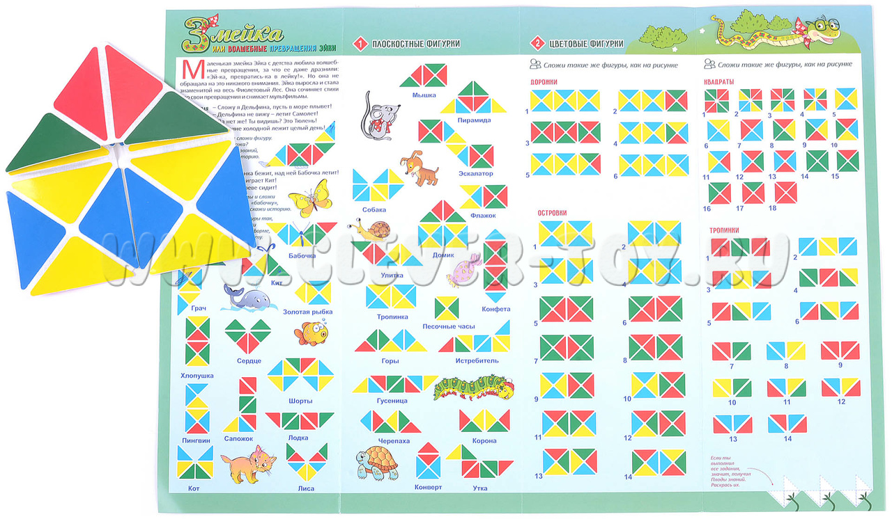 - как складывать плоскостные фигуры: так, чтобы они были походи на рисунок сначала по форме, затем – по форме и цвету; в первом разделе приведено 35 схем-рисунков, которые помогут превратить головоломку в конфету, золотую рыбку, рубашку и шорты, лису, улитку, гусеницу, истребитель и т.д.