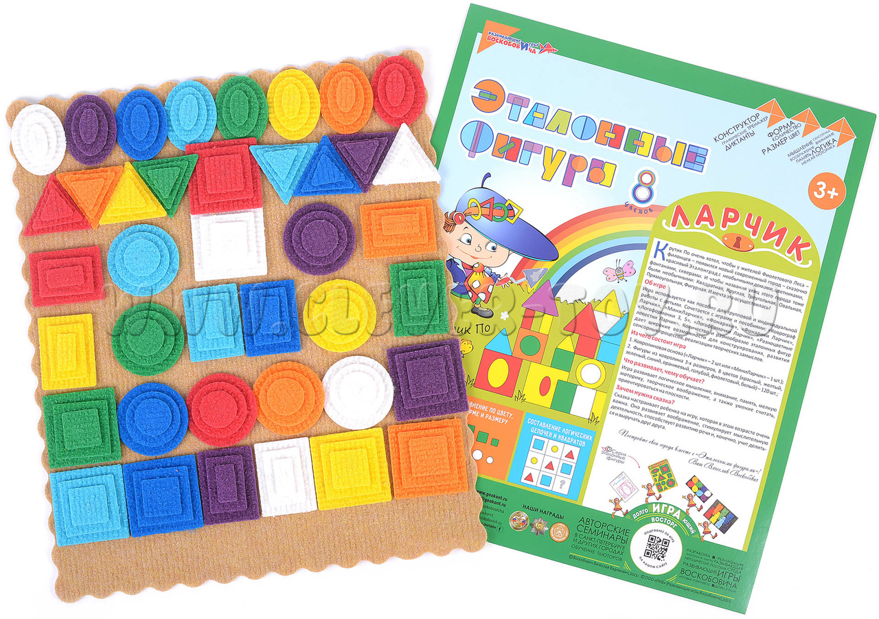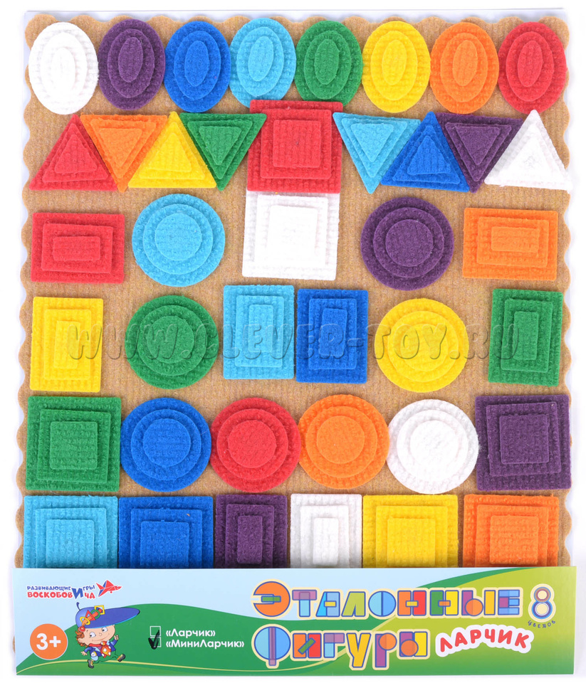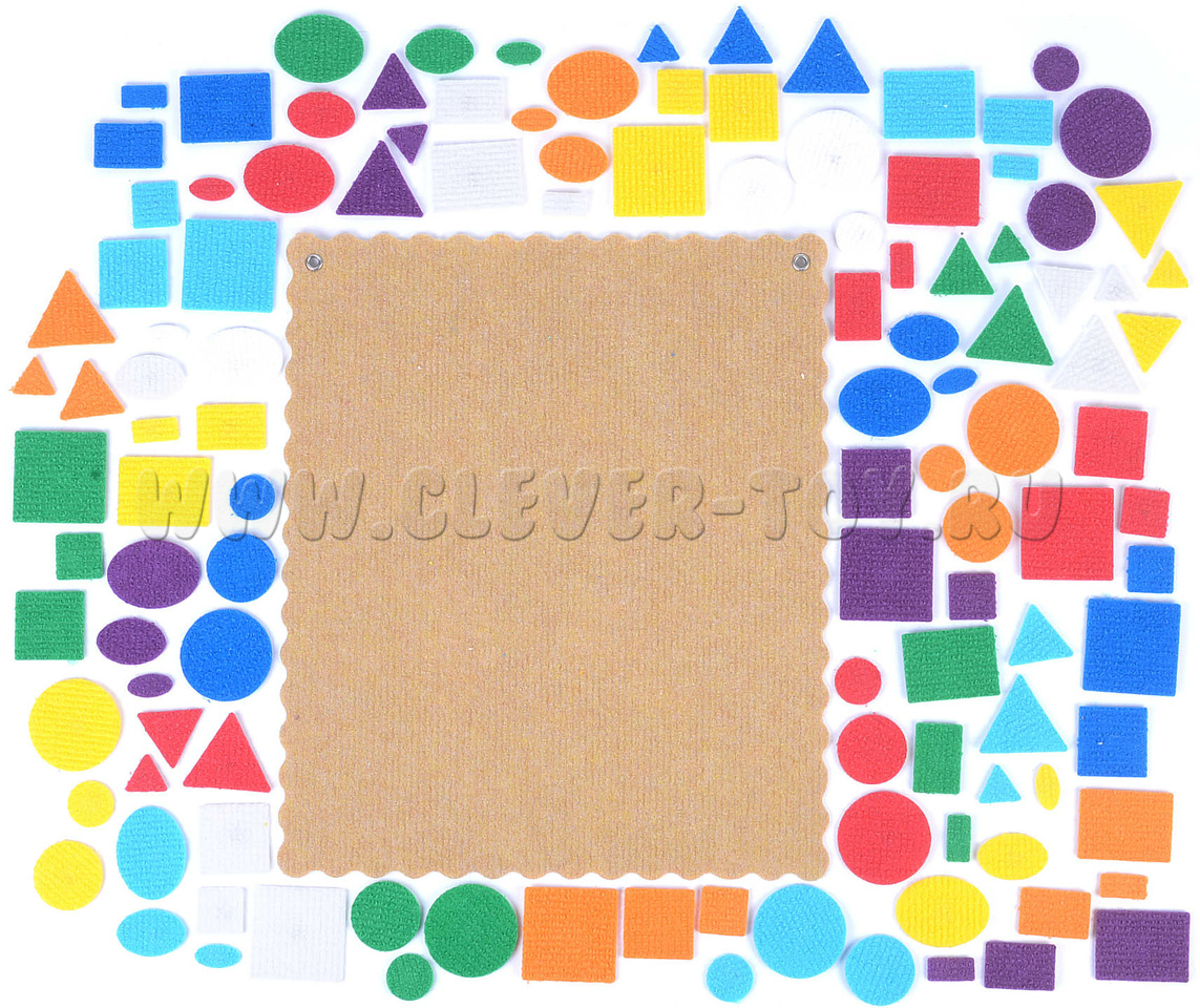- Фигуры из ковролина 3-х размеров,8-ми цветов (красный, жёлтый, зелёный, синий, оранжевый, голубой, фиолетовый, белый):