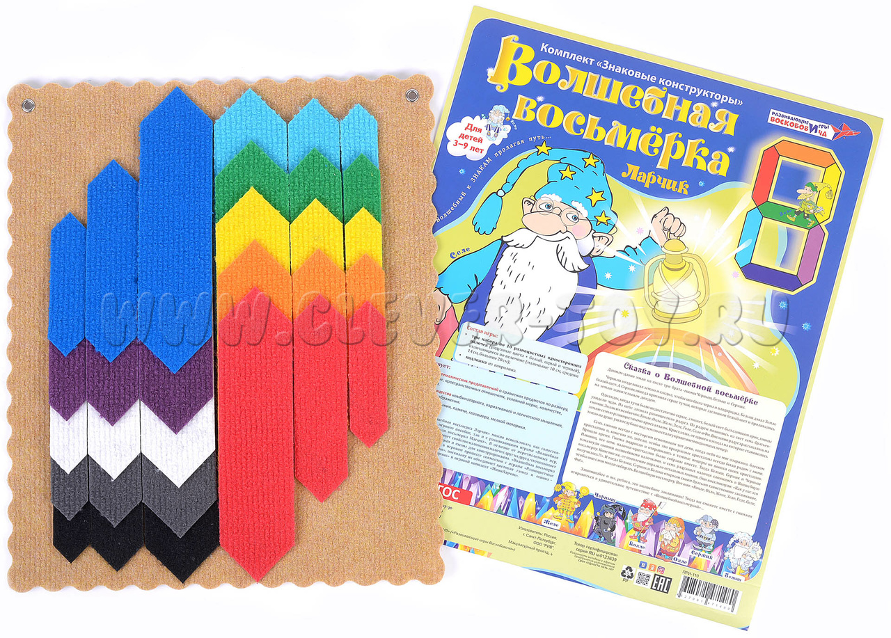 Игра «Волшебная Восьмёрка Ларчик» для детей от 3 до 9 лет может использоваться совместно с развивающими играми «Волшебная Восьмёрка (1,2,3)», «Волшебная Восьмёрка Магнит». В отличие от перечисленных игр, «Волшебная Восьмёрка Ларчик» имеет свойство наложения палочек друг на друга, что позволяет разнообразить задания с дорожками и схемы для конструирования.