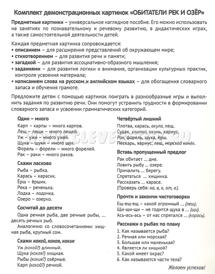 Комплект "Обитатели рек и озер" познакомит детей с удивительным миром пресноводных рыб, моллюсков и даже рептилий. Многие из них уже известны, а о некоторых дети узнают впервые. Издание состоит из 16 цветных картинок с текстом на обороте. Дети не только получат ценную информацию, но и ответят на вопросы, отгадают загадки и прочитают стихотворения.