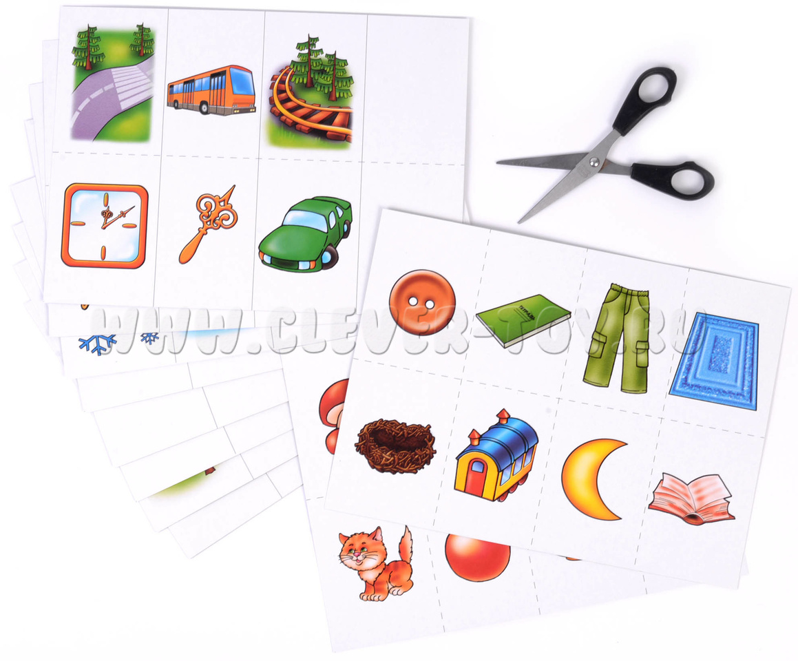 В наборе папка для хранения и 10 карт: 16 неоконченных смысловых цепочек и 16 картинок-окончаний. Перед началом игры разрежьте карты по пунктирным линиям. Предложите малышу найти закономерность и подобрать подходящую к цепочке картинку, выложив ее на пустую клетку карты. Попросите ребенка аргументировать свой выбор.