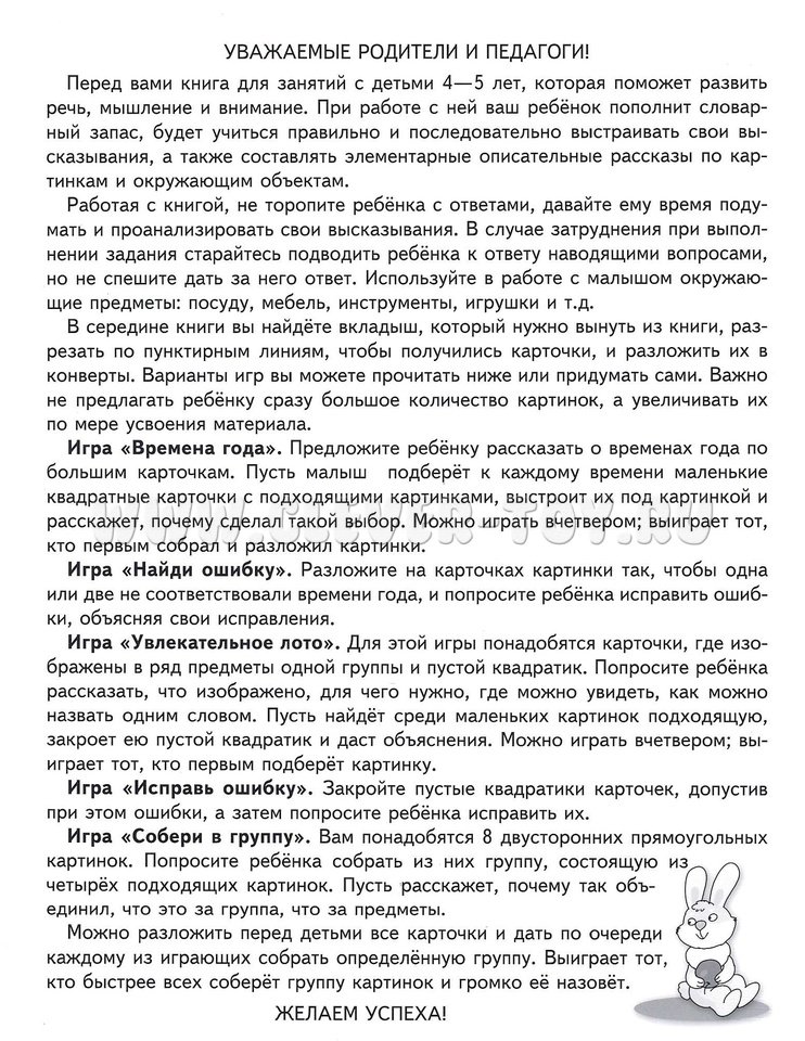 В середине книги есть картонный вкладыш, который нужно вынуть из книги, разрезать по пунктирным линиям, чтобы получились карточки, и разложить их в конверты. Варианты игр даны в рекомендациях взрослым.