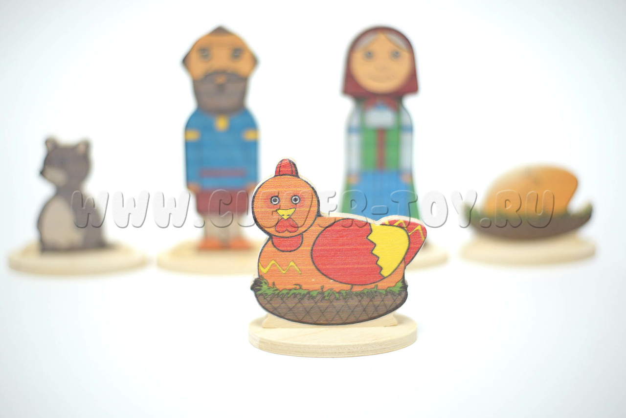 • 5 сказочных персонажей на подставках(Дед, Бабка, Курочка, Мышка, Яйцо) от 5 до11,5 см.;