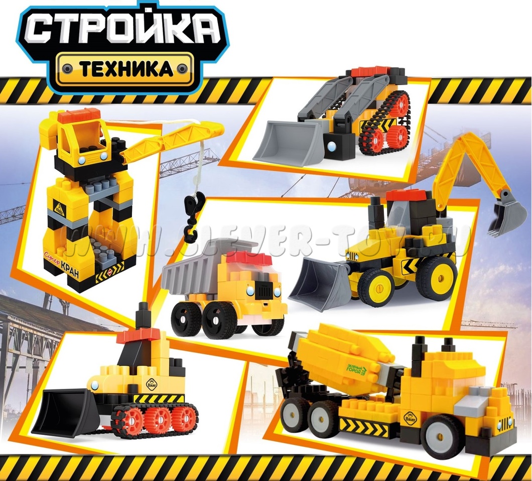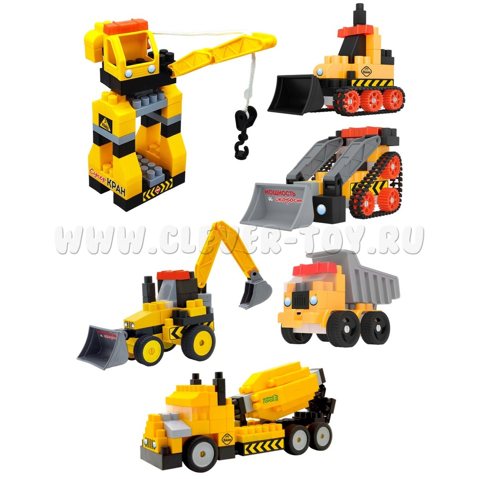 Комплектующие для создания моделей строительной техники: трактор с колесным приводом, бетоносмеситель, грейдер, подъемный кран, автомобиль-самосвал, гусеничный трактор; 6 пластиковых фигурок рабочих, монтажный набор инструментов.<\p>