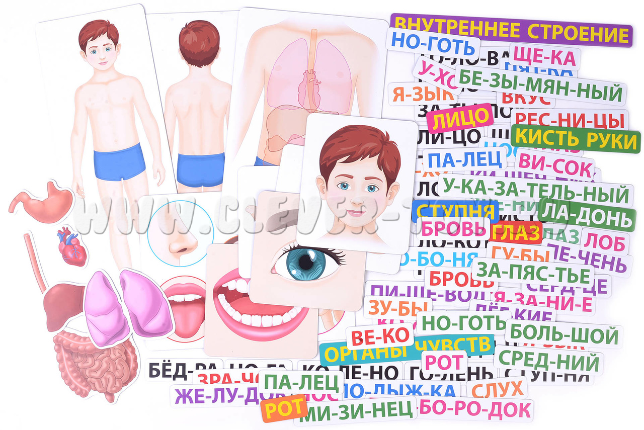 В наборе 88 магнитных карточек трёх видов: плакаты с изображением тела или его частей (сами служат магнитной основой); названия, разбитые по слогам; внутренние органы (знакомим с ними постепенно, по возрасту).