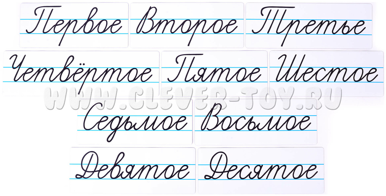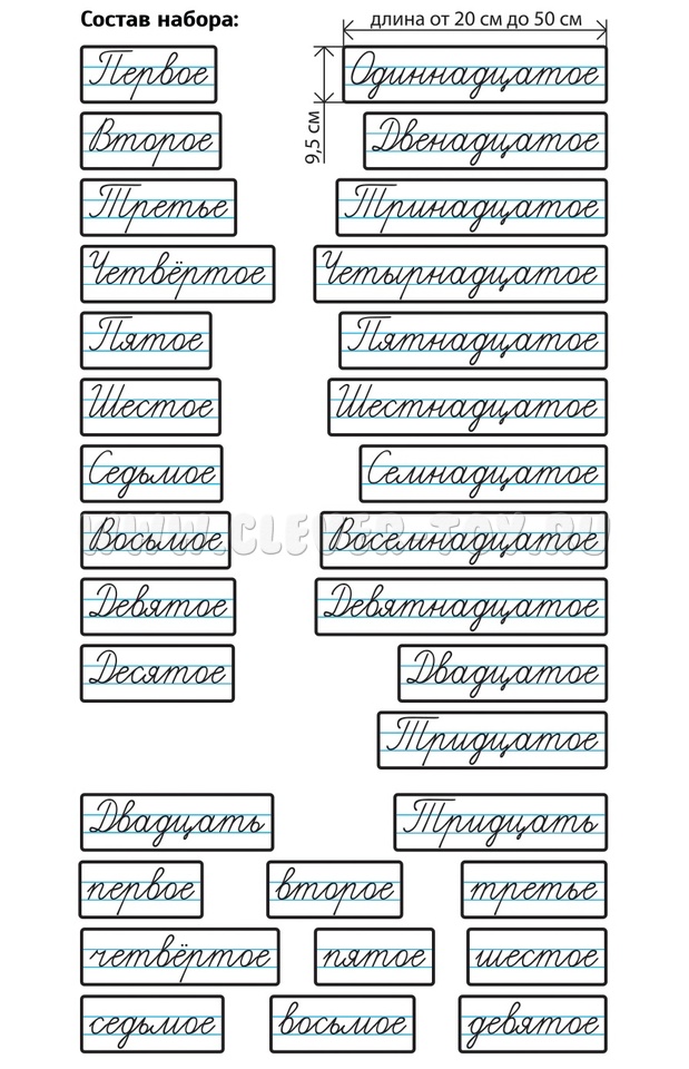 В комплект входят 32 карточки размером 9,5 см х 20-50 см. Высота букв 3 см.