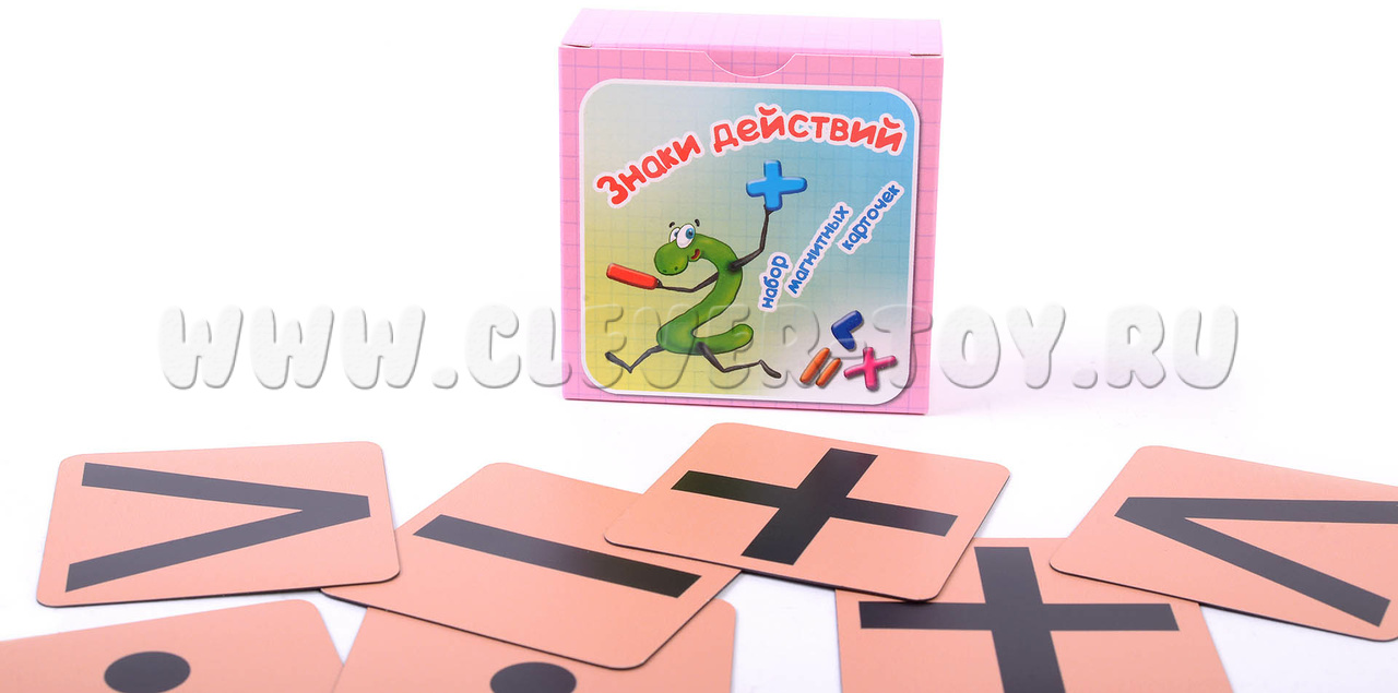 Когда мы, по просьбам учителей начальных классов, выпустили «Числа от 1 до 20», нам ничего не оставалось, как укомплектовать их знаками действий. Ведь это следующий важный шаг в освоении арифметики. Знаки действий мы выпускаем на оранжевом либо фиолетовом фоне, в каждом наборе 9 карточек, вот таких: