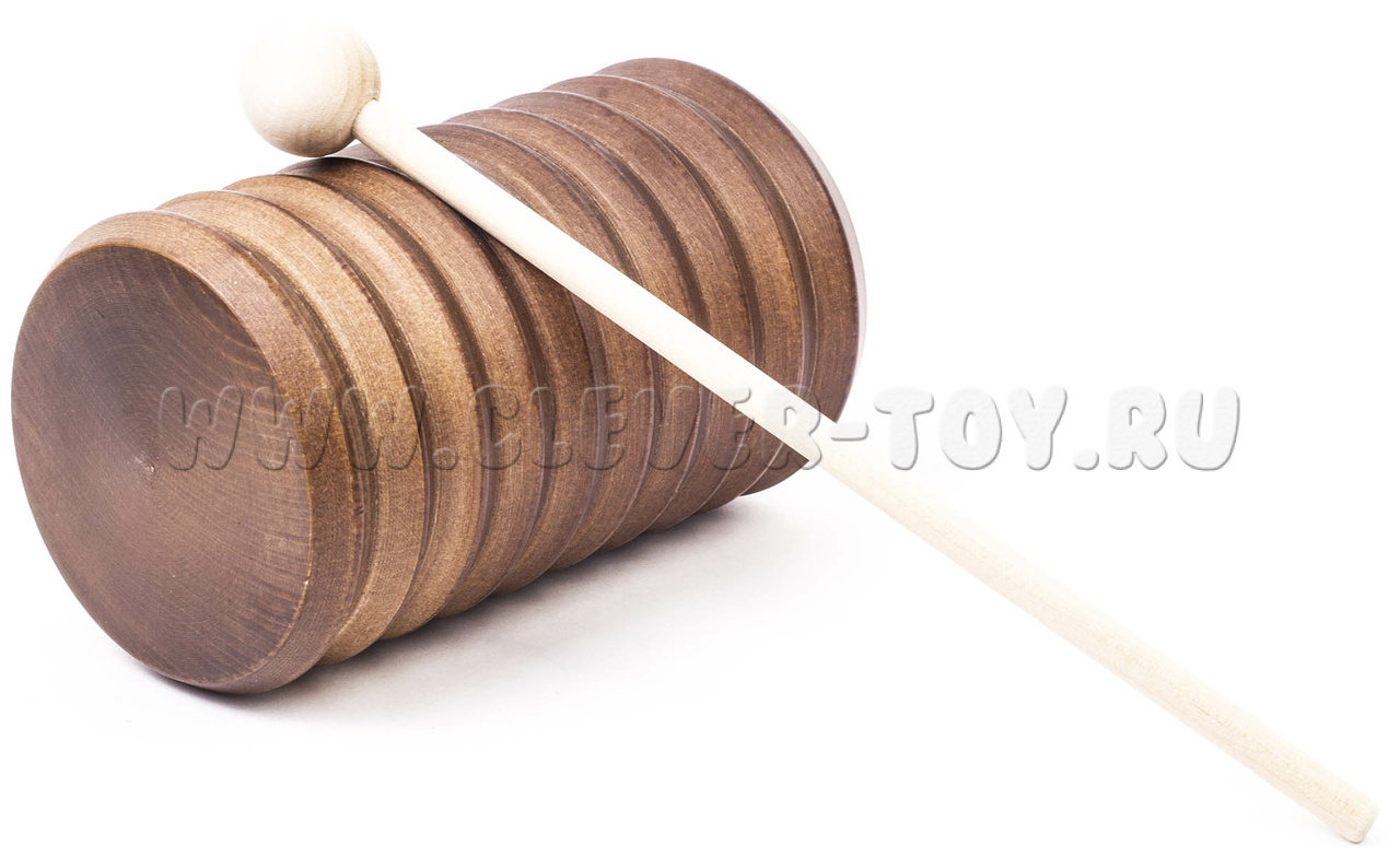 Погремушка представляет собой полый деревянный цилиндр диаметром 65 мм и высотой 120 мм. Внутрь стакана засыпана охотничья дробь. Сверху стакан наглухо закрыт деревянной крышкой. С наружной стороны ребристый. Канавки под углом 90 градусов выполнены токарным способом. Музыкальный инструмент комплектуется ударной палочкой с шариком на конце. Материал: липа.