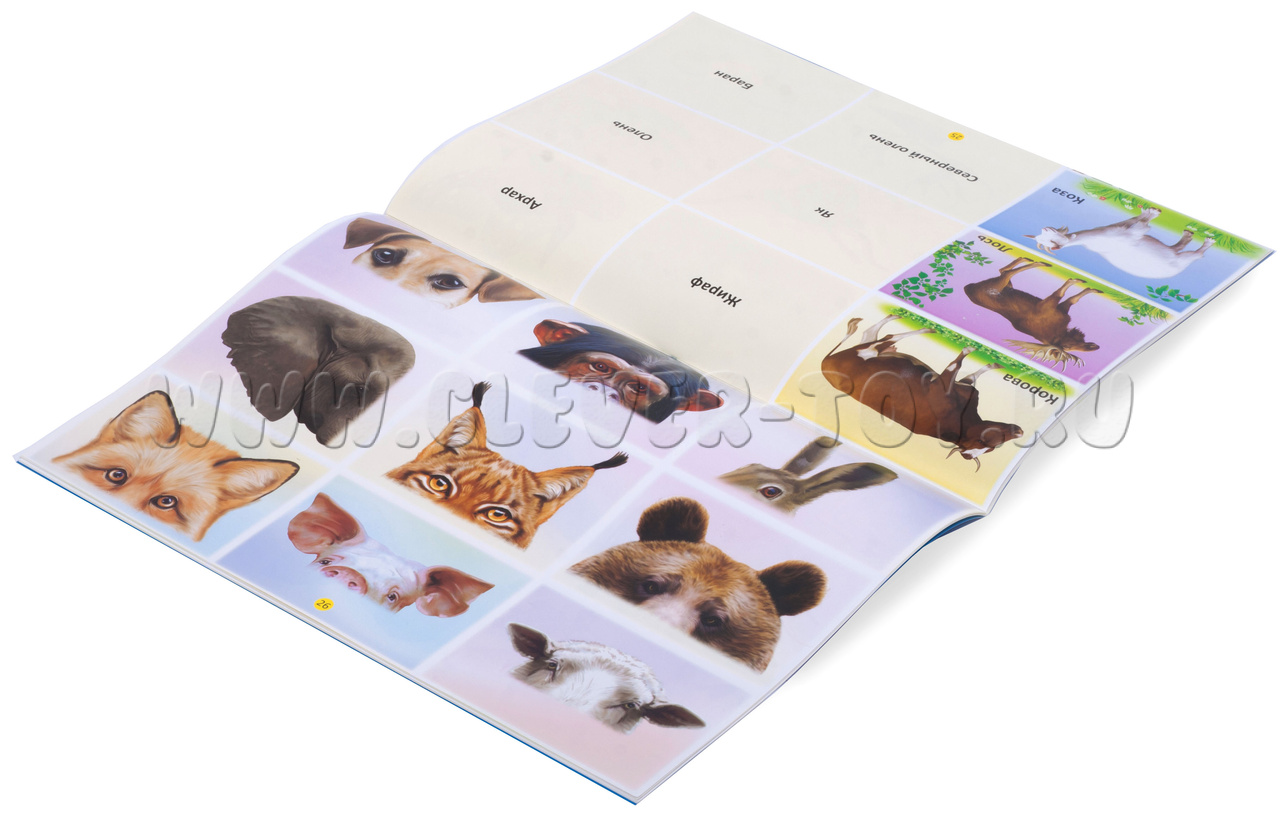 - знакомит ребёнка с представителями животного мира (щука, баран, заяц, лошадь, гусь, лиса, белка, свинья, ёж, лягушка, дикобраз, орёл, хорёк, леопард, скунс, панда, лев, енот, тигр и др.);